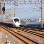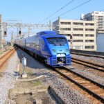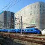 In 1995 upgrading of services on the northern section of the Nippô Honsen (Kokura – Ôita) was a pressing requirement in the face of increasing highway traffic and railway express trains with unattractive interior design and insufficient running speed. Thus 8 new 20 kV/60 Hz alternating current trains of class 883 were built 1994-1997. They are of a unique, playful design and have stainless steel coach bodies. Tilting allows speeds of up to 130 km/h. Sets 1 to 5 are 7-car trains (KUROHA 882 – SAHA 883 – MOHA 883 – SAHA 883 – MOHA 883 – SAHA 883 – KUMOHA 883). Sets 6 to 8 were originally 5-car trains; each set received two additional coaches in 2008, built with aluminum alloy coach bodies as class 883-1000 (KUROHA 882 – SAHA 883 – MOHA 883 – MOHA 883-1000 – SAHA 883-1000 – SAHA 883 – KUMOHA 883). Class 883 are based at Ôita and operate through intercity express trains from Fukuoka (Hakata station) via Kokura down to Ôita and Saiki.