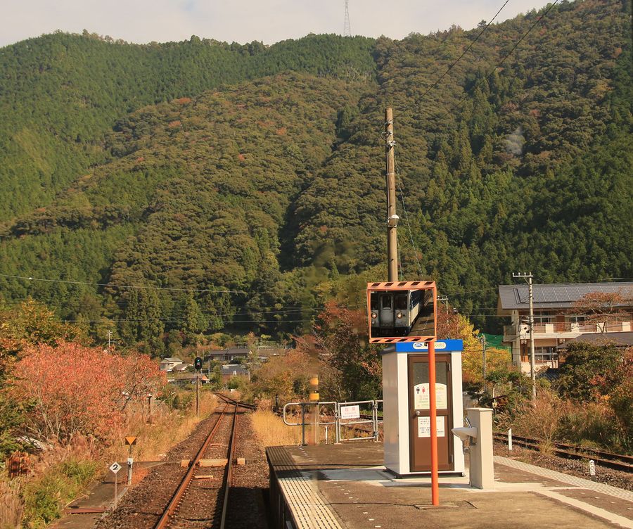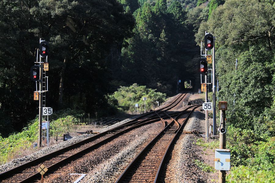 7219 At Kawaoku, where the lines to Uwajima (on the left) and to Nakamura and Sukumo (Tosa Kuroshio Tetsudô, on the right) separate. The Sukumo Line will now enter the spiral tunnel. (2017)