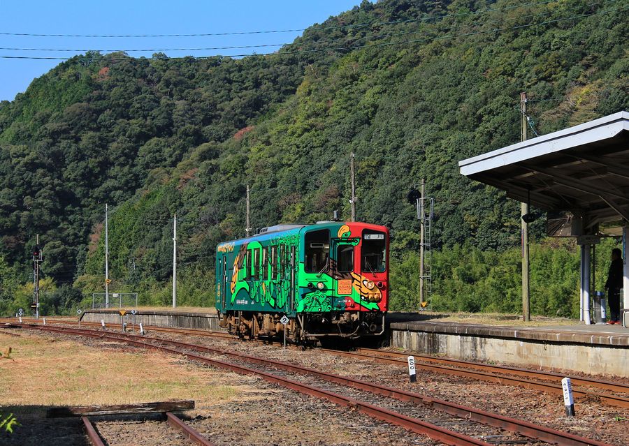 7365 Car KIHA 32 no. 4 arrives from Uwajima. (2017)